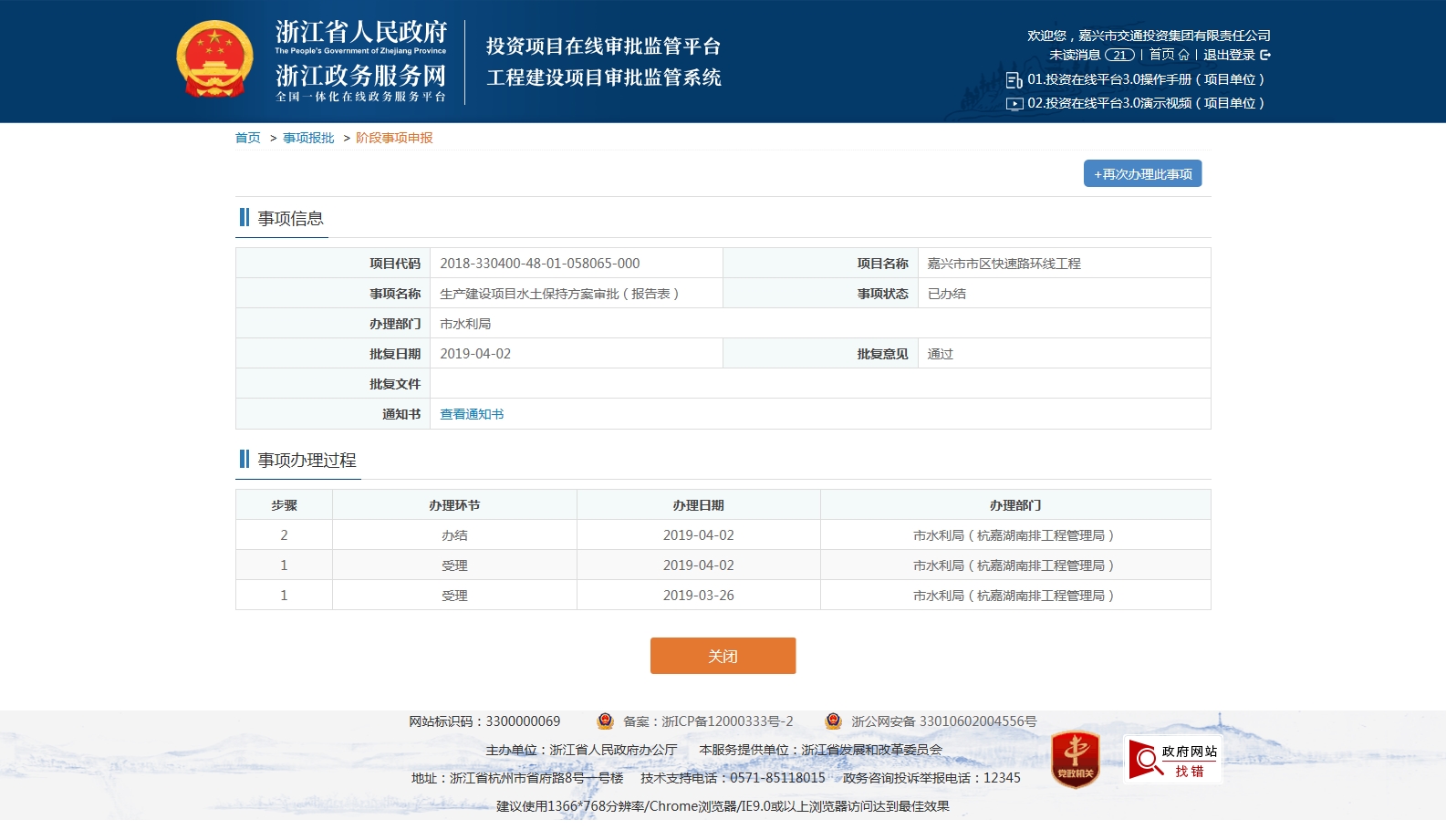 嘉興市市區快速路環線工程一期生產建設項目水土保持方案審批